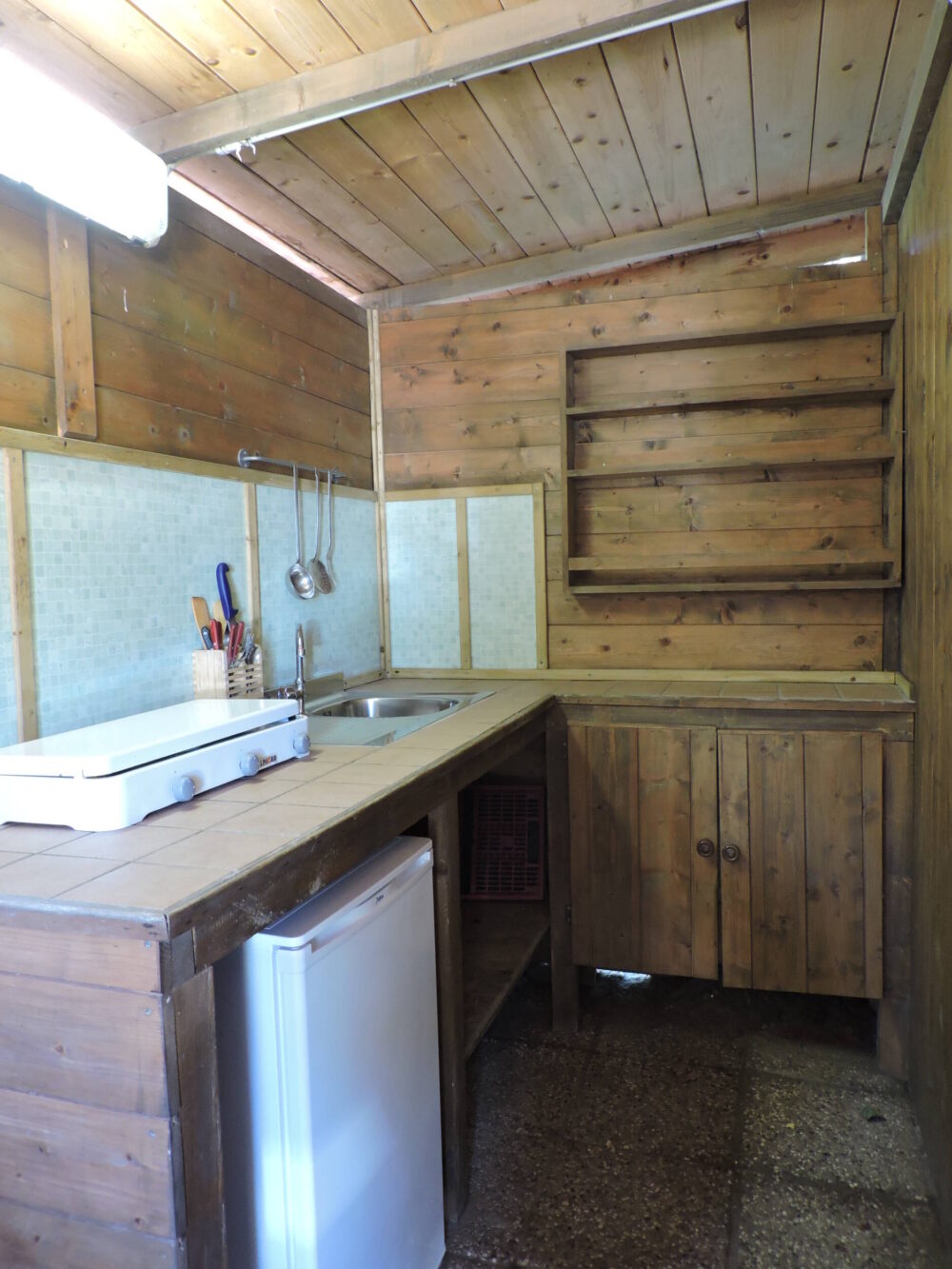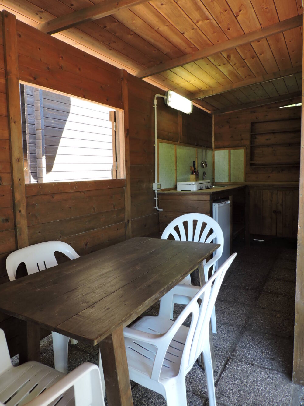 Veranda auf 3 Seiten geschlossen, mit Kochnische komplett mit Geschirr und ausgestattet mit Tischen und Stühlen, Parkplatz in der Nähe der Unterkunft.