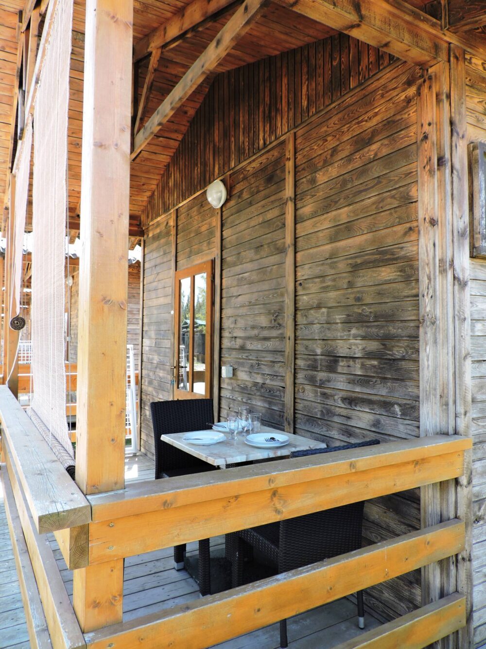 Buiten: Gemeubileerde veranda met tafels en stoelen. Parkeerplaats naast de accommodatie.